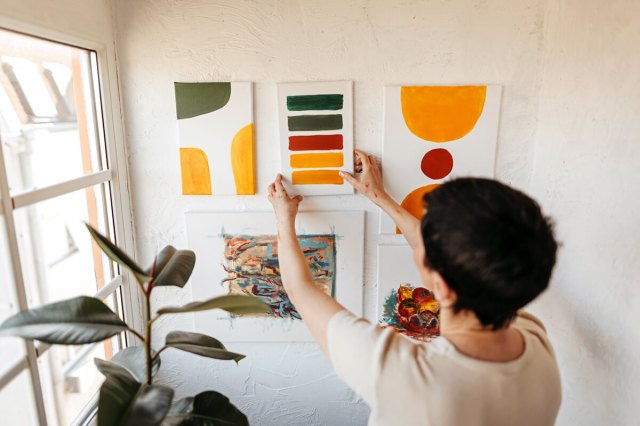 Before you start hammering nails into your walls willy-nilly, come up with a game plan — otherwise, you may end up with a wall full of holes that need patching and painting. TikTok creator Katie Behlert Kruithof of Yeah Baby Goods uses this technique: